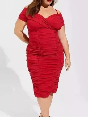 Curve-hugging midi with ruched detailing. Off-shoulder neckline with thin straps. Stretch fabric for a comfortable fit. Sleek, feminine silhouette for events or nights out.