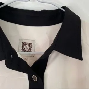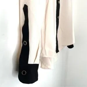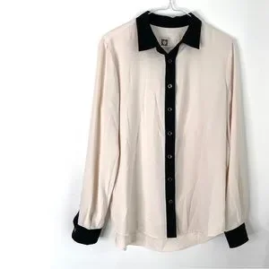Elevate your office wardrobe with this Anne Klein nude button-down blouse featuring chic black trim along the button panel and cuffs.