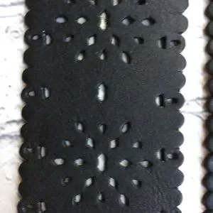 Classic Liz Claiborne belt. Black scalloped leather with laser-cut floral pattern. Rounded silver metal buckle. Versatile accessory for dresses or jeans.