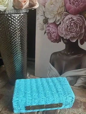 Kurt Geiger clutch in bright turquoise woven texture. Gold-tone chain strap and decorative clasp. Compact and eye-catching for day or evening. Lightweight and effortlessly stylish.