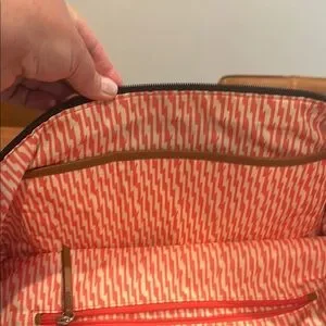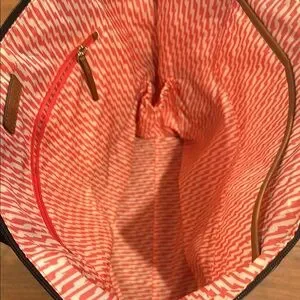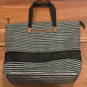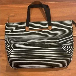 Spacious striped tote in black and white. Features sturdy black handles with brown trim. Top zip pocket for easy access. Expandable,Casual, versatile carryall perfect for everyday use. Cell phone pocket, water bottle pocket located inside.