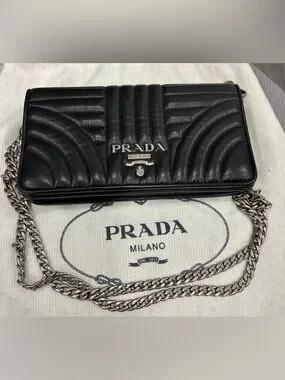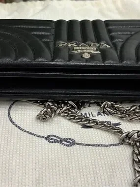 Authentic Prada black quilted leather chain wallet with signature Prada Milano logo and silver-tone chain strap. Can be worn as a crossbody or carried as a clutch—perfect for everyday or evening wear.
