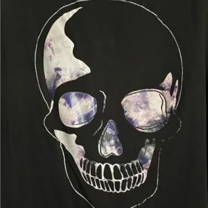 Black short sleeve tee featuring a prominent skull graphic from the Lovesick collection. Subtle purple and white swirls appear within the skull design. New without tags. Size 3X