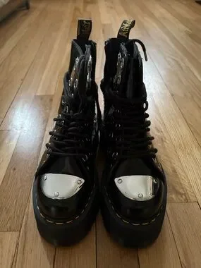 Classic Dr. Martens lace-up boots in black. Silver metal eyelets and hardware. Unfortunately too small and have to let my favorite go. Worn once as you can tell on the bottoms they’re basically still pretty new