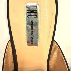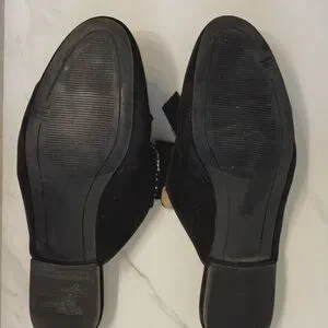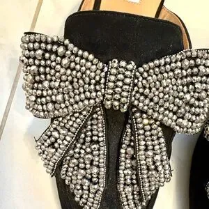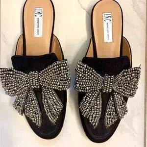 Chic slip-on mules by INC International Concepts. Black upper with large crystal-embellished bow accent. These shoes are so comfortable! They were worn once only indoors for a dinner party!