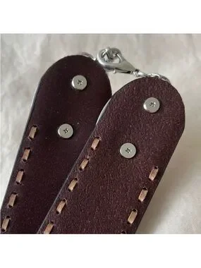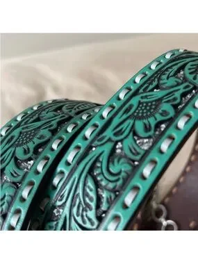 Turquoise leather belt with floral tooling. Decorative silver conchos and chain closure. Western-inspired style for casual outfits.