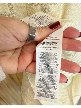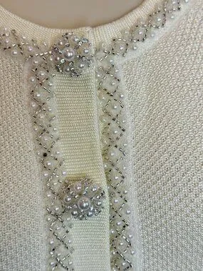 Polyester blend fabric. Made in China. Dry clean recommended. Unlined. Front button closure. Crystal, faux pearl, and bead-embellished midweight knit fabric. Our Style No. SPOF-WD383. Manufacturer Style No. SS24-215S-C.