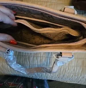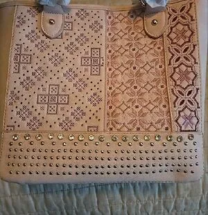 Montana West tote in blush pink. Decorative embroidered panels across the front. Row of rhinestone studs for sparkle. Dual top handles with stud accents. Spacious interior ideal for daily use.