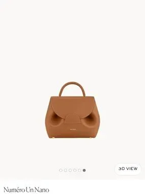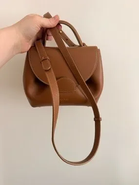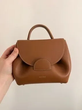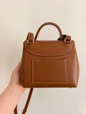 mini top-handle bag in rich brown leather. Smooth calfskin with clean stitching and subtle gold logo. Compact silhouette ideal for daily essentials. Versatile brown shade complements casual and polished looks.