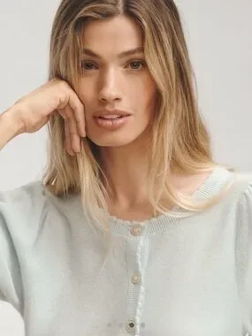 Light pale blue knit with short puff sleeves. Scalloped edges along neckline and hem. Pearl-like buttons run down the front. Soft, feminine silhouette for casual or dressed-up looks.