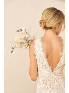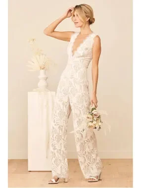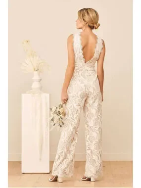 Bridal beauties everywhere will love the intricate lace fabrication of this elegant jumpsuit, which includes a sleeveless bodice with a plunging V-neck and back. Trendy wide pant legs ensure effortless movement, so you can spend less time worrying and more time dancing! Hidden back zipper/clasp.