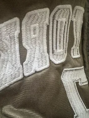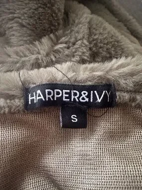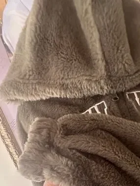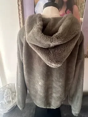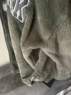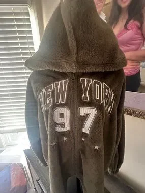 Cozy olive faux-fur jacket with a large hood and front zip. Features bold "New York 97" embroidered lettering and subtle star details. Soft, plush fabric for everyday warmth and stylish casual wear. Olive color adds versatile, on-trend appeal.