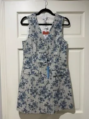 NWT Sleeveless V-neck mini dress with blue floral print on white stripe fabric. Button-front styling and subtle pocket details. A-line skirt for easy movement. Fresh, feminine look for daytime wear.