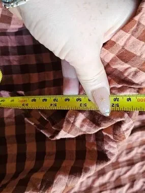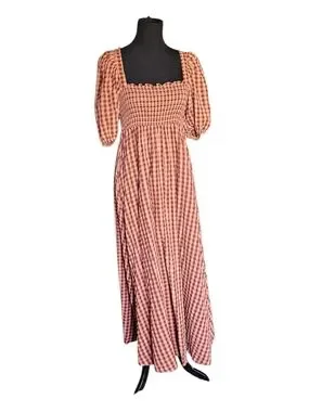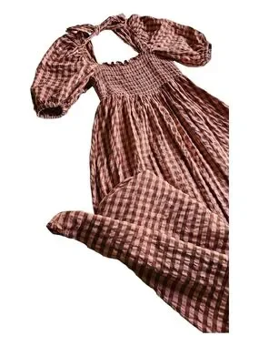 Smocked bodice with a square neckline. Puff sleeves add vintage charm. Flowing maxi skirt for easy movement. Lightweight gingham fabric with subtle texture. Feminine and versatile for day or evening.