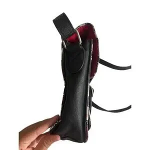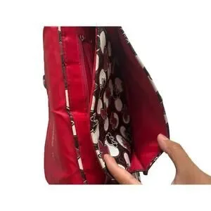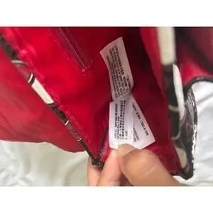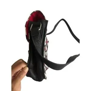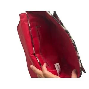 The bag also includes a multicolor handle/strap, a red lining color, and is made of polyurethane material.