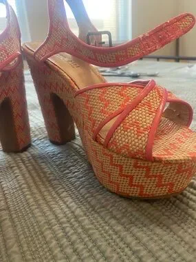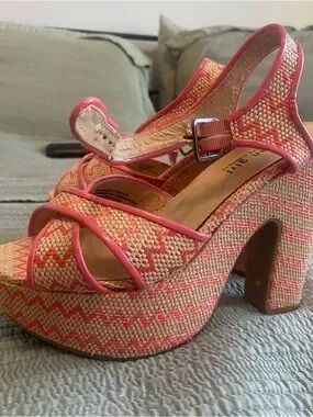 Woven straw platform sandals with bright coral-pink trim. Crisscross straps and ankle buckle for secure wear. Chunky heel adds retro flair. Lightweight design for warm-weather style. Some wear and tear on the strap.