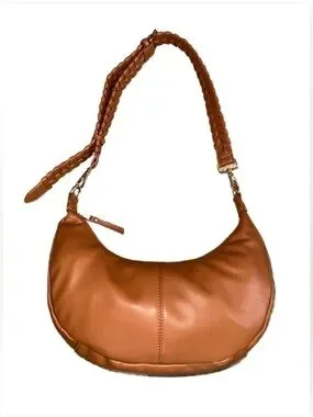 Smooth tan crescent shoulder bag with a braided strap. Soft faux-leather finish with subtle seam detailing. Streamlined silhouette for everyday use. Neutral tan complements a range of outfits.