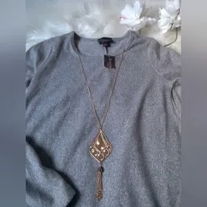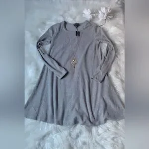 Soft knit long sleeve sweater dress with a relaxed A-line swing. Crew neckline and simple silhouette for easy styling. there is a tiny flaw with the neckline see pictures for details. features built in necklace.