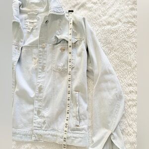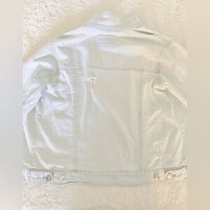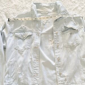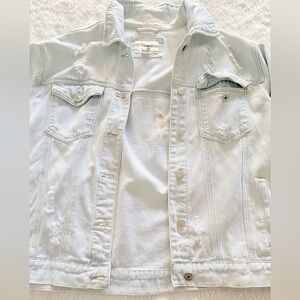 Stylish light wash denim jacket. Features classic button front. Perfect for casual wear.