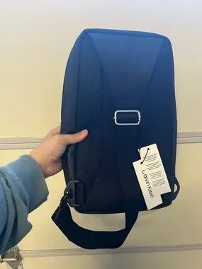 Calvin Klein belt bag in black. Multiple zippered compartments for essentials. Adjustable strap for hands-free wear. Subtle logo on front. Durable textile with metal zipper accents.