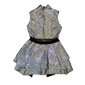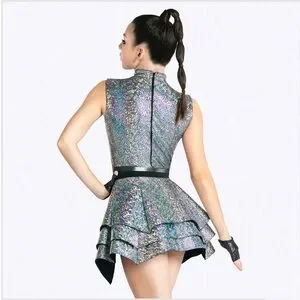 This costume style features foil dot and holographic spandex with a structured skirt and zipper back, designed for performance durability and visual impact.