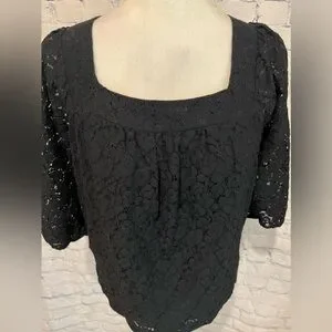 This New York & Company blouse is a must-have for any stylish woman's wardrobe. The 3/4 sleeve, square neck, and black lace overlay create a chic and sophisticated look that is perfect for any occasion. The blouse is made of high-quality cotton material and is a size small.