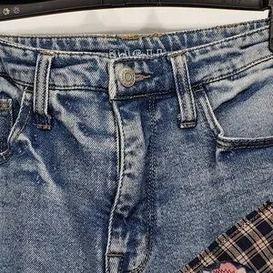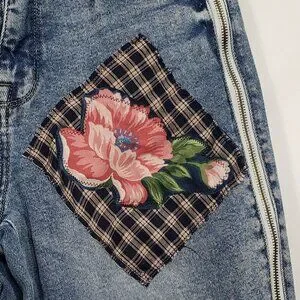 I've upcycled these plain jeans with a mixture of florals, plaid & edgy zippered sides - cool contrast