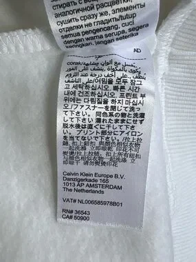 Calvin Klein full-zip jacket. White body with a black chest panel and white logo. Front zip and pockets. Clean, modern logo styling.