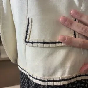 Anne Klein cream colored linen blazer with black trim and three-quarter length sleeves. Hidden buttons in the front.
