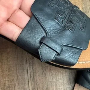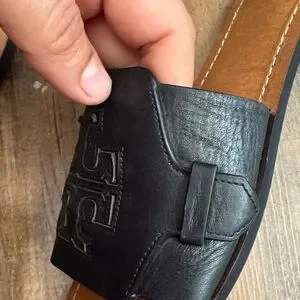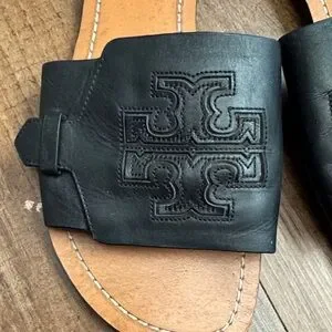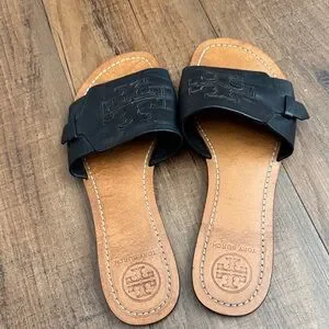 Classic Tory Burch slide sandals. Black leather upper with embossed logo. Smooth tan leather footbed with contrast stitching. Easy slip-on style for everyday wear.