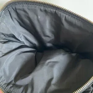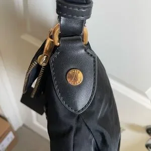 Compact crossbody with adjustable strap. Black nylon body with leather trim. Gold-tone hardware accents. Front flap and zip closure. Lightweight and easy to carry.