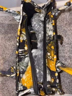Stylish tote bag in mustard yellow, black and white abstract print. Features dual top handles and a gold-tone accent medallion. Spacious, versatile design for everyday use. The mustard yellow and black pattern adds bold, modern flair.