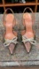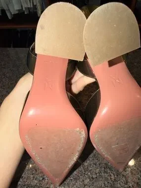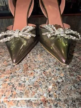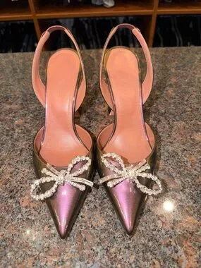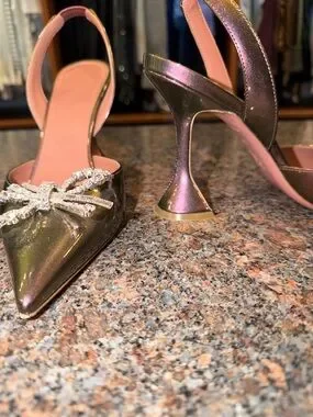 Iridescent slingback pumps from Amina Muaddi. Pointed toe with sparkling crystal bow accent. Sleek glossy finish that shifts between pink and green. Elegant silhouette for dressy looks.