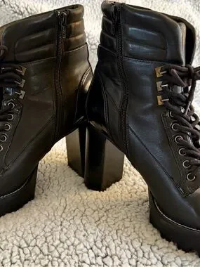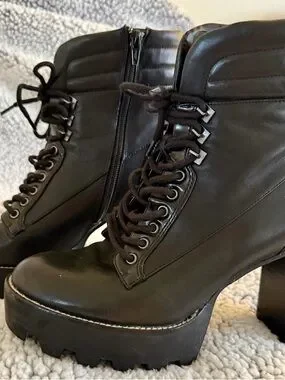 Sleek black leather-look ankle boots with chunky platform heels. Lace-up front with side zipper for easy on and off. Cushioned collar and sturdy block heel for confident, all-day wear. Versatile black design that pairs with dresses or denim.