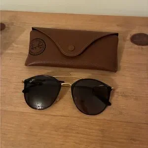 Stylish Ray-Ban round sunglasses. Black rims and dark lenses. Gold bridge and temples. Comes with brown Ray-Ban case. Sleek everyday design.
