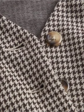 Two-piece houndstooth skirt set with a tailored vest top. V-neck vest with button front and pocket flap details. High-waist pleated skirt creates a flared silhouette. Classic monochrome pattern for versatile styling.