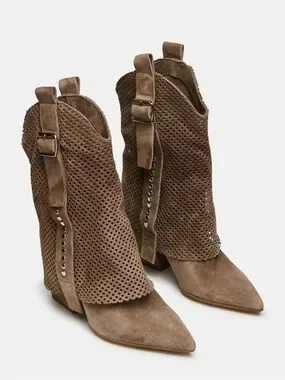 The AUBRIELLE TAUPE SUEDE boot delivers Western-inspired sophistication with a striking pointed-toe silhouette and dramatic fold-over cuff. Silver toned metal buckle and studded detailing along the shaft adds an edgy, fashion-forward element that elevates traditional aesthetics. The structured design balances bold styling with wearable elegance, making it an ideal choice for those seeking a contemporary take on classic Western footwear. Perfect for statement-making occasions or everyday wear that demands attention. Crafted with a taupe suede leather upper, leather lining, and a leather sole for a premium feel.