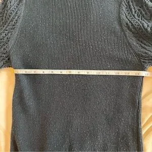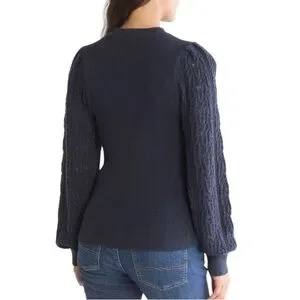 Keywords: Splendid sweater, Puff sleeve, Cable knit, Mock neck, Navy blue knit, Textured sleeves, Ribbed knit, Fitted sweater, Long sleeve top, Chic knit, Elegant sweater, Cozy knit