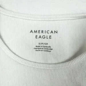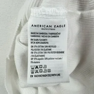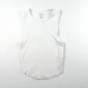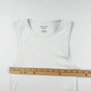 American Eagle ribbed tank top in a crisp white shade features a classic crew neckline and a flattering curved hem. This sleeveless essential is crafted from a comfortable cotton blend with a hint of stretch, providing a fitted silhouette that works perfectly as a base layer or a standalone piece. The fine vertical ribbing adds subtle texture to this versatile wardrobe staple.