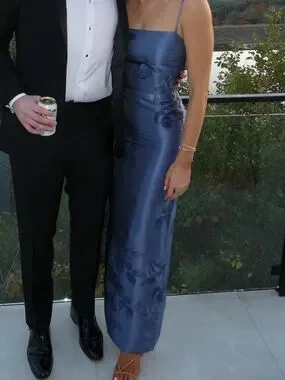Sleek satin maxi dress with subtle floral jacquard. Thin spaghetti straps and straight neckline. Figure-skimming silhouette with elegant drape. Minimalist, refined evening style. Worn once as a bridesmaid dress, fit is true to size!