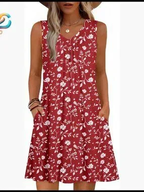 Sleeveless V-Neck Pleated Sundress with Pockets, Knee Length Casual Dress