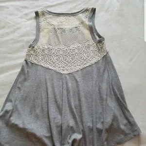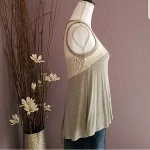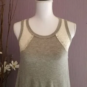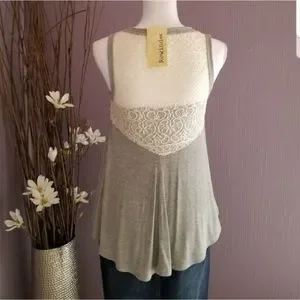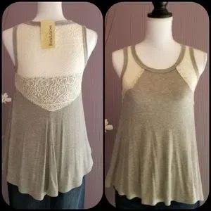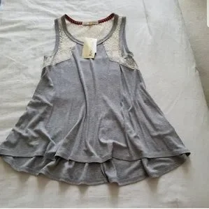 New with tags, beautiful swing tank top in heather gray, and off-white lace inserts on the shoulders and in the back. Drapes beautifully.