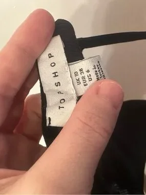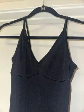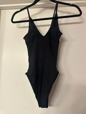 Sleek black ribbed bodysuit. V‑neckline and high cut hips for a flattering fit. Stretchy knit fabric hugs the body. Versatile layering piece for day or night.