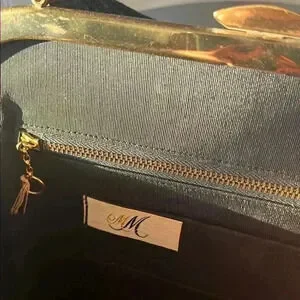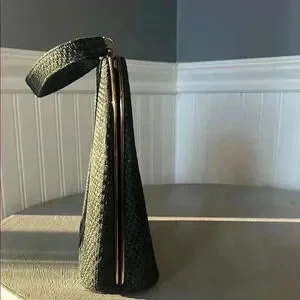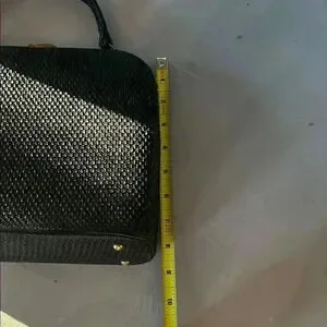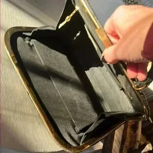 This vintage handbag from the 1960’s has black woven fabric with gold hardware that lines the opening. The top latch is magnetic and it closes and opens with no issues.