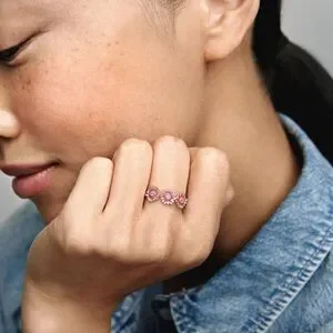 14k rose gold plated ring decorated with three enamel flowers with cubic zirconia.