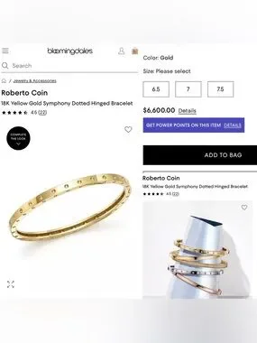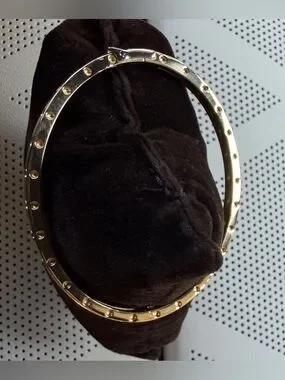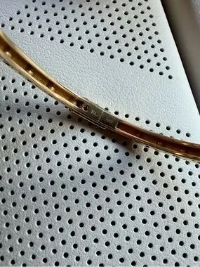 Roberto Coin's Symphony Pois Moi Collection this elegant oval bangle is made from 18K yellow gold. Their stylish dimpled design lines along the entirety of the bangle and the hinged edge allows easy application. Whether you wear alone or stack alongside your other Roberto Coin pieces you cannot go wrong with this timeless, always popular collectors dream bangle. Retail price $6600.