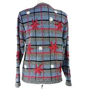 Grannycore Silver Bespoke Beaded Snowflake Sweater Winter Themed Poinsettias Thanksgiving Dated 2002 Y2K