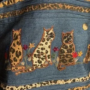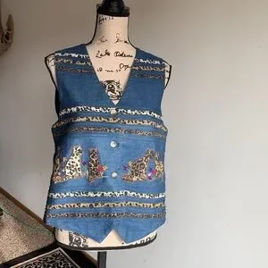 Vintage denim kittens with flowers design vest. Leopard stripes across front, button front close, solid navy blue back.
