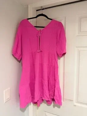 Vibrant pink tiered mini dress with a V-neck. Short puff sleeves and a flowy silhouette. Lightweight, breezy fabric for easy wear. Feminine and playful style for daytime outings.