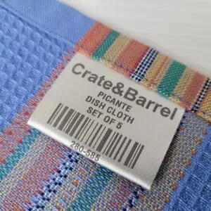 Set of 5 Crate & Barrel dish towels in the Picante pattern featuring vibrant orange and red tones. A stylish and functional addition to any kitchen.